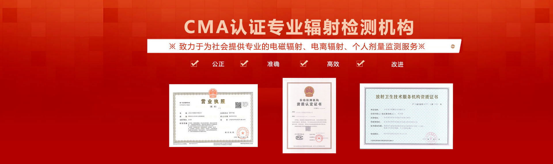 公司提供專(zhuān)業(yè)的電離輻射、電磁輻射、噪聲環(huán)境檢測(cè),并提供CMA資質(zhì)報(bào)告
